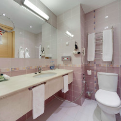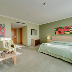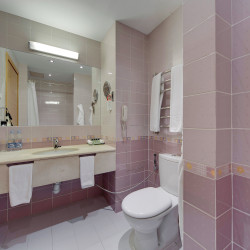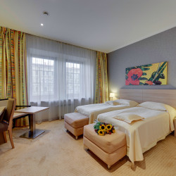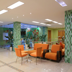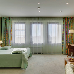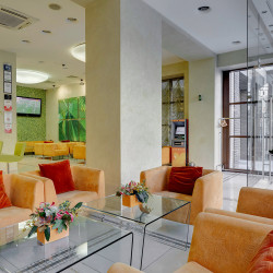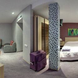 Das Atrium trägt zum modernen Stil des Interieurs bei. Die ungewöhnliche Kombination von gelben, grünen und purpurroten Farben schafft warme und behagliche Atmosphäre. Ein Zimmer und der Hoteleingang werden besonders für die physisch arbeitsunfähigen Leute entworfen.
