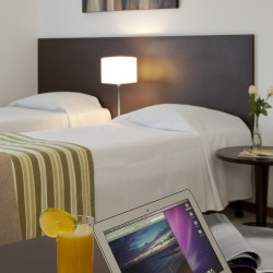 Das 4-Sterne Hotel verfügt über 82 komfortabel ausgestattete Zimmer mit Klimaanlage, Minibar und Zimmersafe.